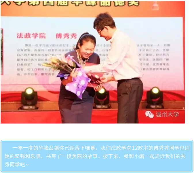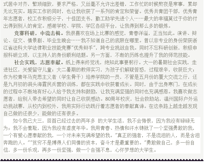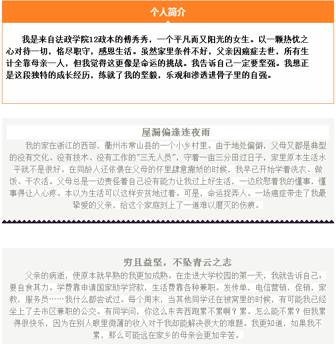 傅秀秀同学获奖感言:无论你信或者不信,我首先想说是:能作为法政的一员,真的很幸福。老师的谆谆教导,同学的互帮互助,学长学姐的经验指导,学弟学妹的鼓励支持,一切的一切,都是那么的温暖,那么的让人感动!在每一个困惑的路口,在每一个想要放弃的瞬间,总能得到一份支持,让你充满力量继续前行。对于这些,一方面我们要心怀感恩,感谢那些为我们呐喊和鼓掌的人;另一方面,我们更要提高对自我的要求,明确自己的目标,坚定自己的梦想,在前行的道路上勇往直前。三句话与大家一起共勉:1.不怕自己不够优秀,就怕比你还优秀的人比你更努力;2.你所认为的极限,可能只是别人的起点;3.于这个世界,我们来过,但不仅仅是来过。