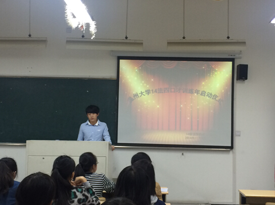 2014年11月9号晚6点,在北2-305教室14法四班全体同学和班主任朱美宁老师一起举行了"温州大学法政麻将胡了试玩 14法四班口才训练年启动仪式"。为提高语言表达能力、法律思维能力、理解阐释能力和交际沟通能力,班级经讨论制定了一套完善的口才训练方案,包括视频学习、速读、背诵、讲故事、复述、描述和角色扮演等阶段。