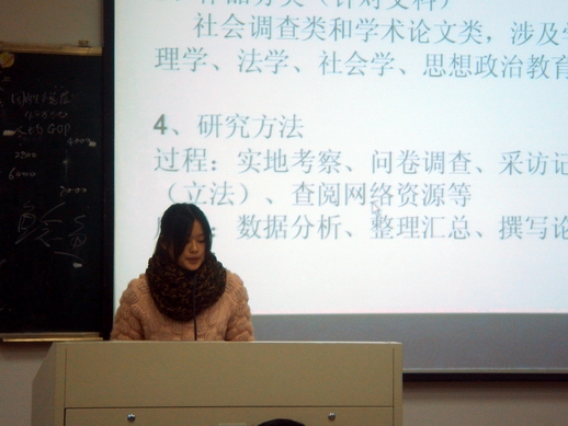 08级杨淳同学从科研课题立项时间、资格要求、立项程序、结题程序等方面作了具体介绍,并与同学们交流了参与大学生科研立项工作的经验和思考。