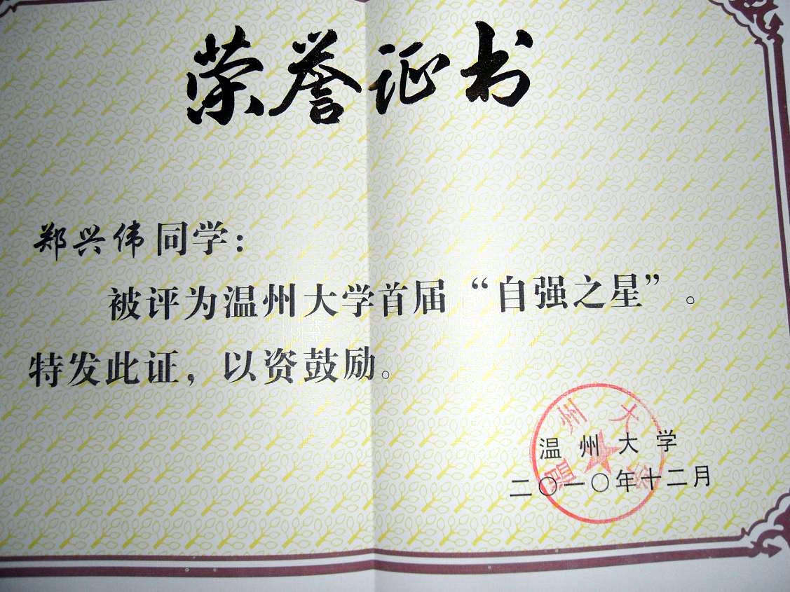 郑兴伟同学被评为温州大学首届"自强之星",郑兴伟同学在麻将胡了试玩(中国)官方网站