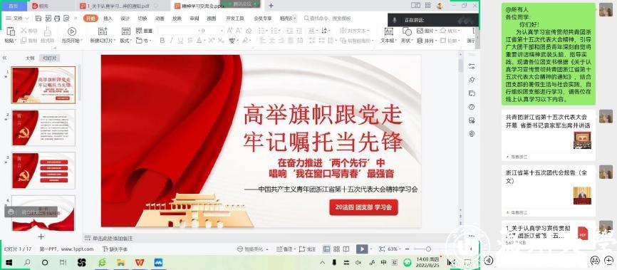 2022年7月22日上午,共青团浙江省第十五次代表大会在杭州开幕,为认真学习宣传贯彻共青团浙江省第十五次代表大会精神,引导广大团干部和团员青年深刻自觉将重要讲话精神武装头脑、指导实践。麻将胡了试玩 各团支部结合本部的暑假生活与社会实践,认真学习宣传贯彻了本次代表大会精神,进一步把握其精神实质和深刻内涵,将其重要讲话核心要义践行在教育实践活动中,做勇于奋斗的青年,喜迎二十大,永远跟党走!