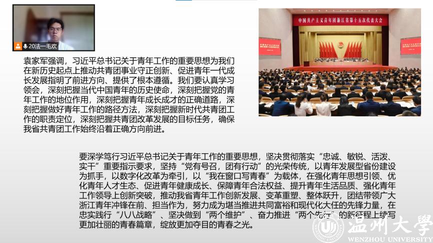 会议中提到今后五年的奋斗目标是全方位、高标准锻造“忠诚敏锐活泼实干”的浙江共青团,唱响“我在窗口写青春”最强音。始终走在“两个先行”最前列,两个“最”的要求,体现了作为新时代的青年,有迈入工作阶段的,已经在各个行业中都有我们青年团员的身影,还有为中国特色社会主义共同富裕先行和省域现代化先行作出巨大贡献的团员。如,洞头先锋女子民兵连副连长曾秀红,奉行“始终做到哪里有需要,哪里就有‘海霞’的身影”;团龙湾区委书记邵赛慧,“作为一名新时代的基层团干部,凝聚更多的青春力量来助力城市的发展”。我们要以团代会上的优秀青年团员为榜样,不断书写青春最强音,助力“两个先行”的发展而不断奋斗。