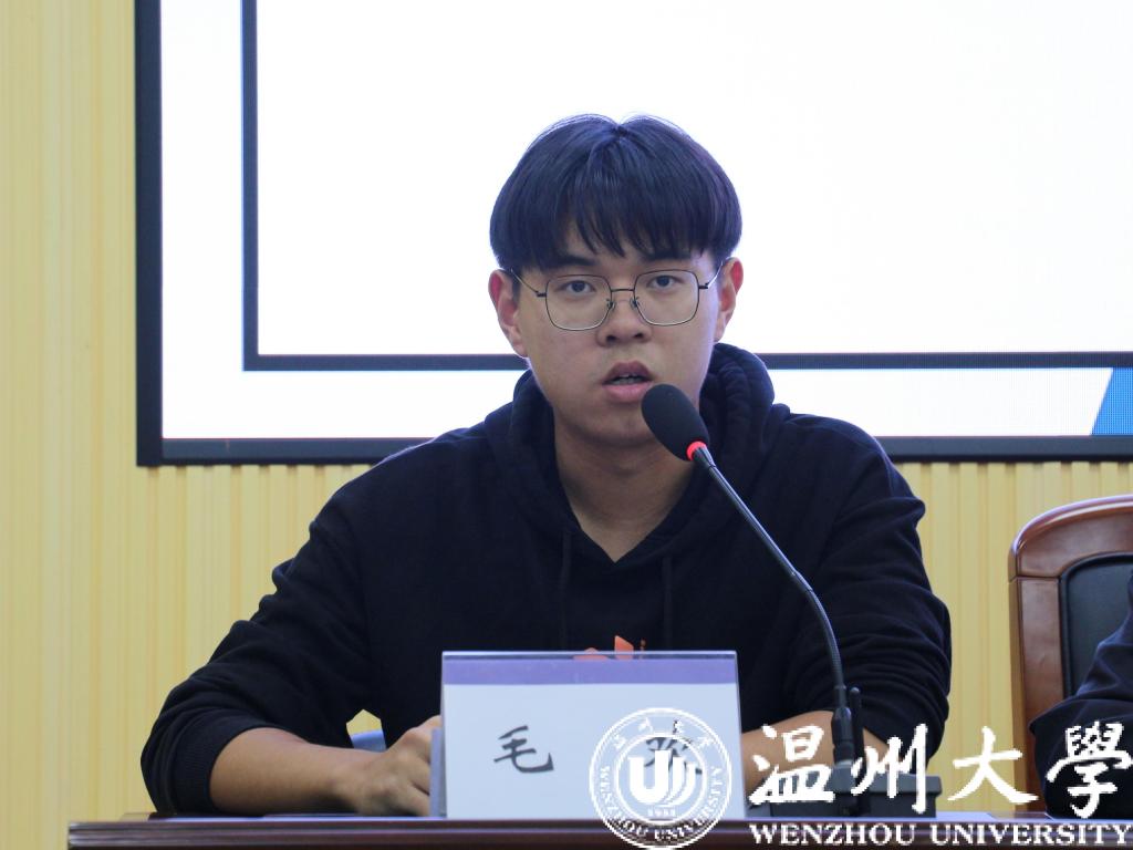 团委副书记毛欢学长代表团学欢迎新成员的加入并以哲学的三大终极问题引入对新干事们未来工作期望:一、要始终有着服务同学的工作态度;二、工作时要具有灵活性、主动性。毛欢学长希望大家在认真学习的同时做好本职工作,为广大师生服务,并祝愿各位干事在团学工作中实现自我突破,提升综合能力!