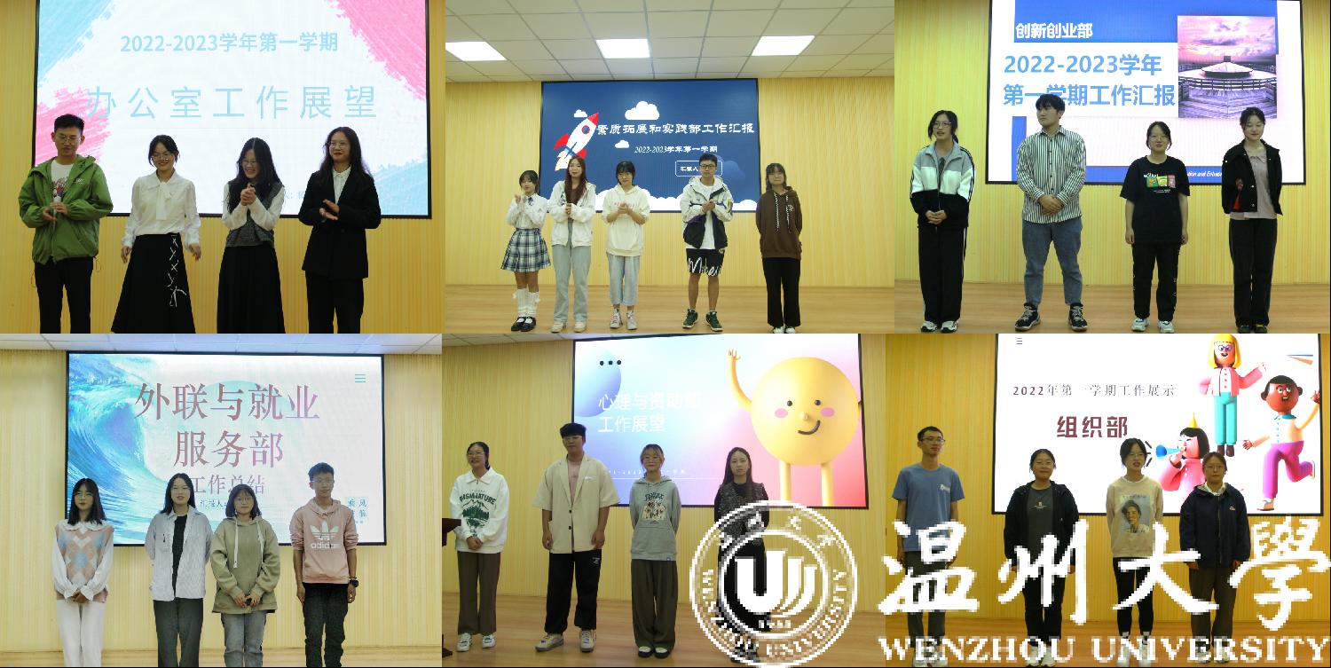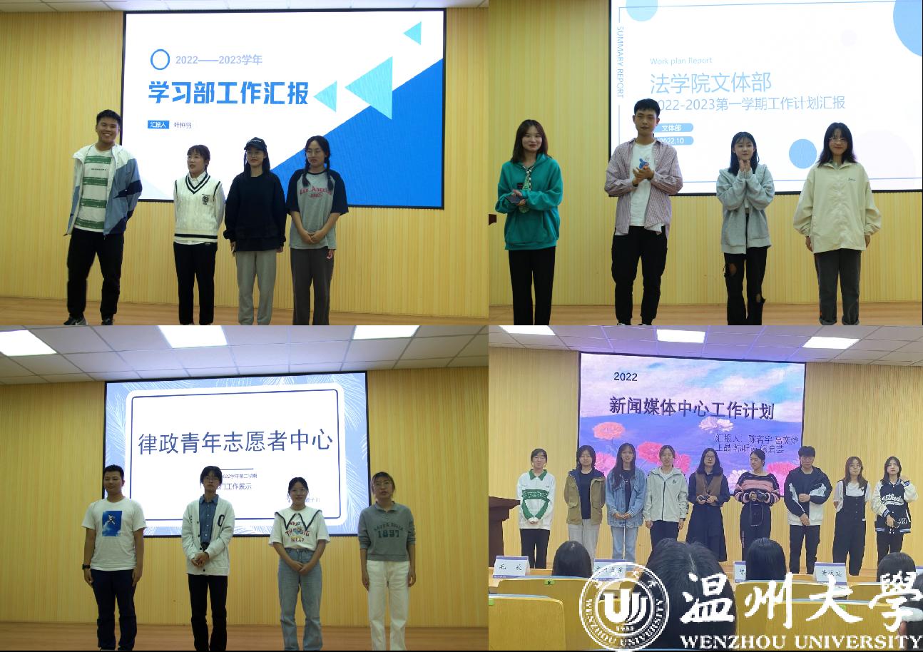 在部门风采展示环节,组织部、办公室、新闻媒体中心、律政青年志愿者中心、外联与就业服务部、学习部、创新创业部、心理与资助部、文体部、素质拓展与实践部以或幽默诙谐,或严肃认真,或活泼动人的风格依次作了部门工作介绍、人员介绍、未来展望,带领大家迅速了解各部门工作,还通过小干事们的自我介绍让大家熟悉各部门成员。