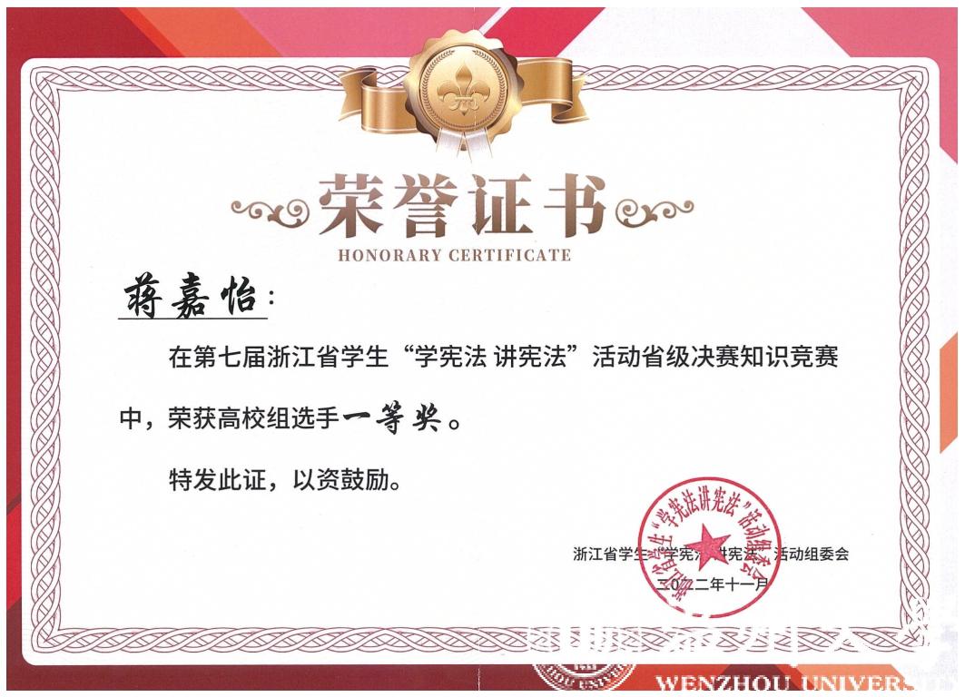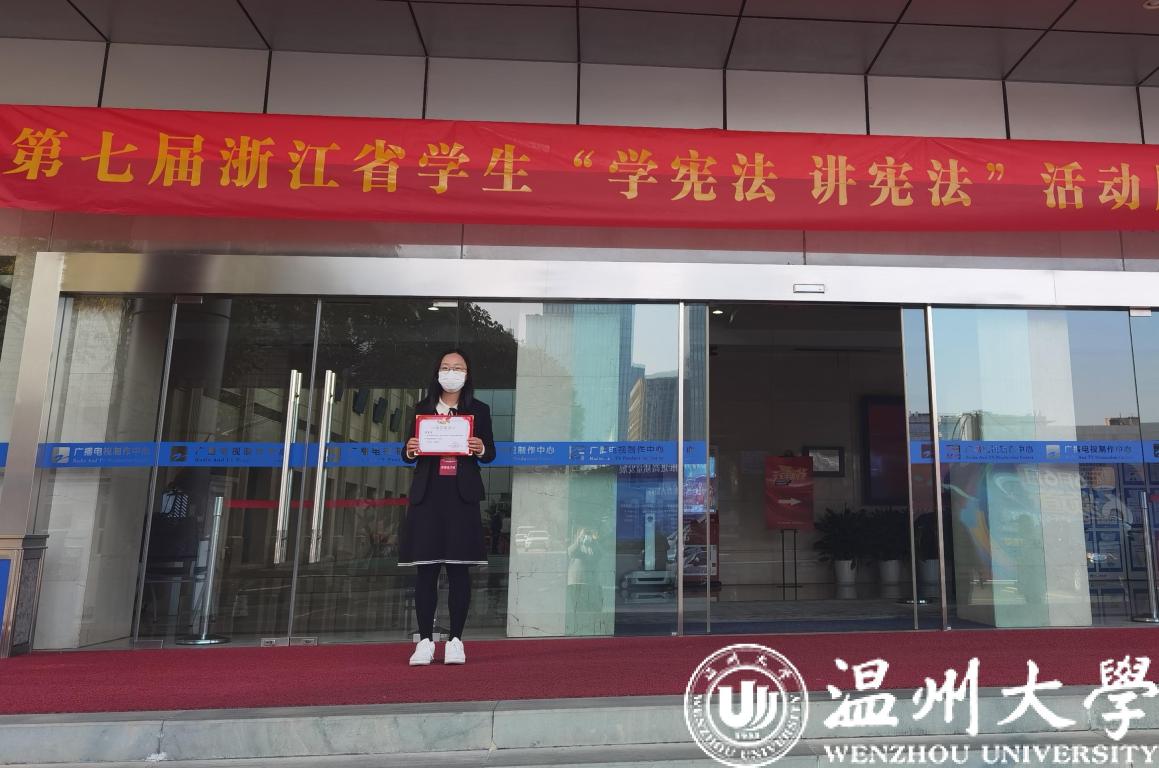 本届比赛设有演讲比赛和知识竞赛两个赛事,分为小学、初中、高中、高校四个组别,经学校推荐、市县选拔,全省共有20名演讲比赛选手和44名知识竞赛选手入围省级决赛。麻将胡了试玩(中国)官方网站 蒋嘉怡同学作为温州大学代表前往杭州参加“学宪法 讲宪法”知识竞赛省级遴选赛,蒋嘉怡同学前期准备充分,赛场上发挥稳定,经过现场笔试、决赛知识竞答及加试环节,最终获得省赛一等奖的优异成绩。