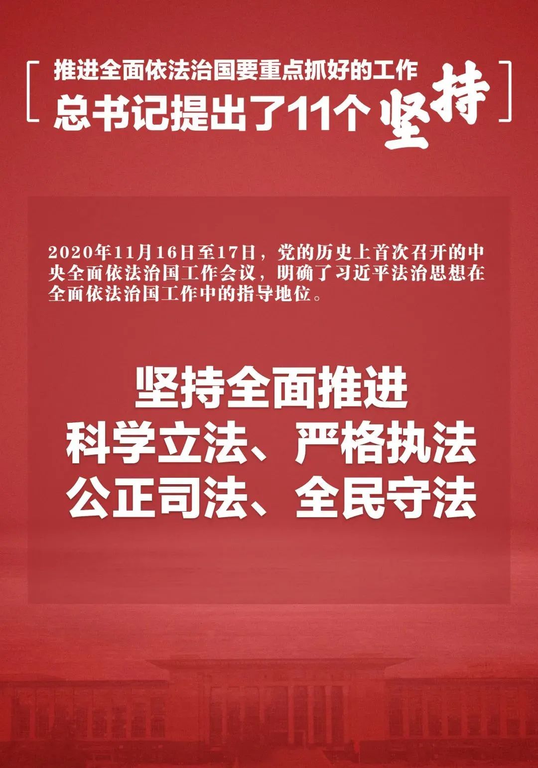 在2020年11月召开的中央全面依法治国工作会议上,习近平总书记用“十一个坚持”系统阐述了新时代推进全面依法治国的重要思想和战略部署,深入回答我国社会主义法治建设一系列重大理论和实践问题。