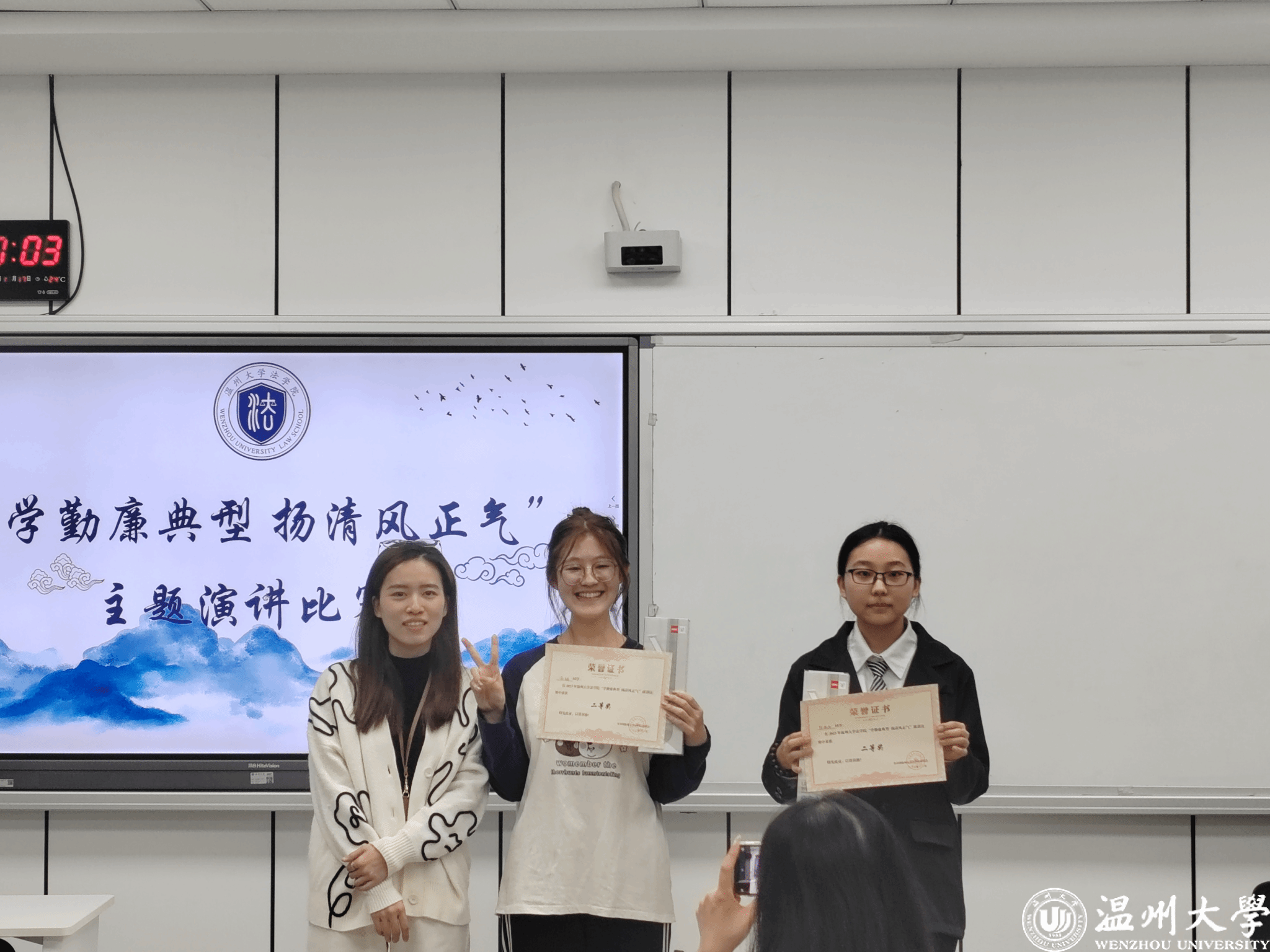 通过此次“学勤廉典型,扬清风正气”主题演讲比赛,展现温大学子的青春风采的同时,也增强了大家的廉洁意识,懂得了廉洁的内涵及重要性。在今后的学习和生活中,让我们携手,用廉洁润初心,坚定中国特色社会主义理想信念,铸造廉洁之魂不负使命担当,增强廉洁治校、廉洁从教、廉洁育人、廉洁修身意识,营造好风清气正、勤廉并重的校园文化氛围。