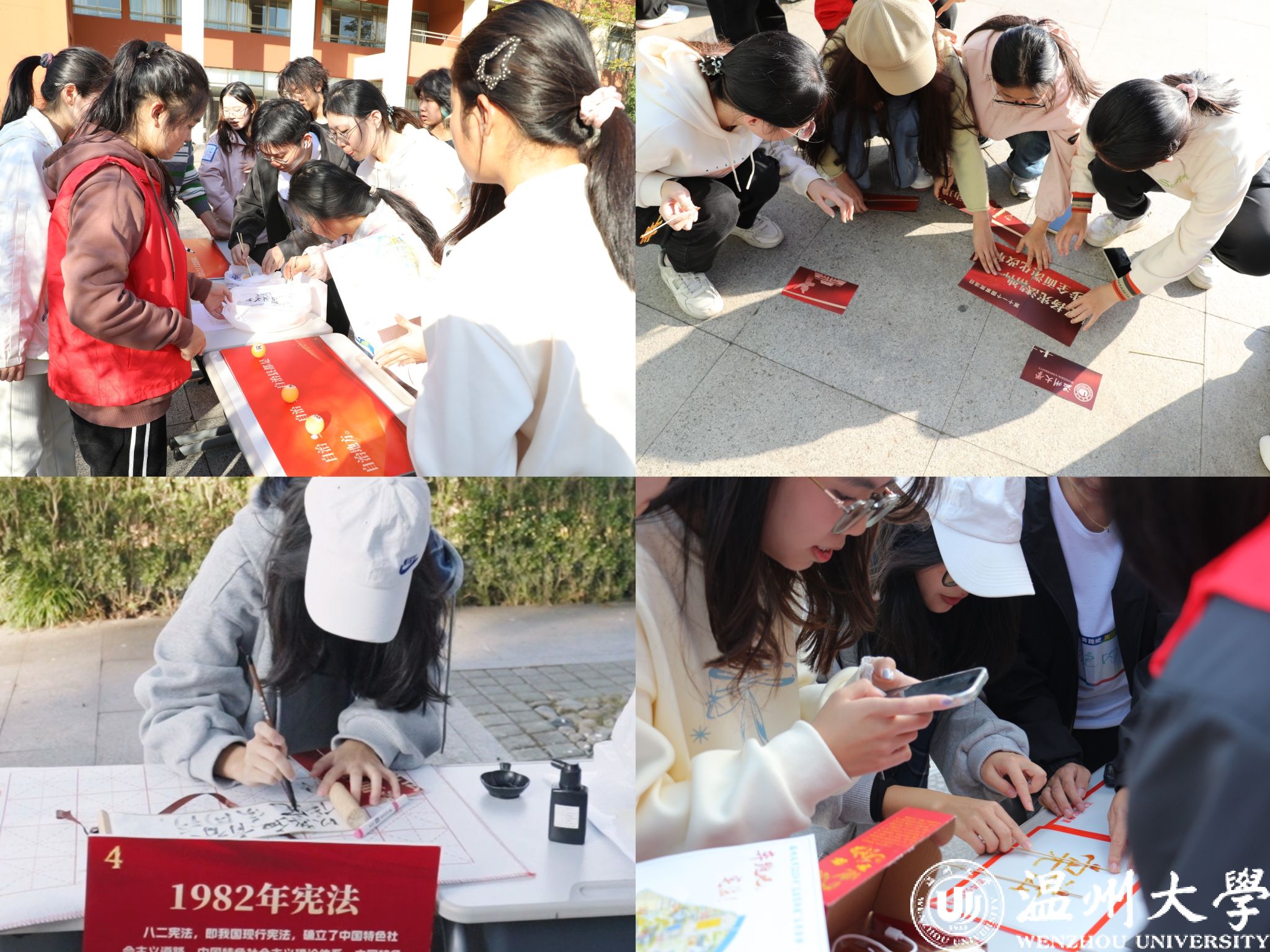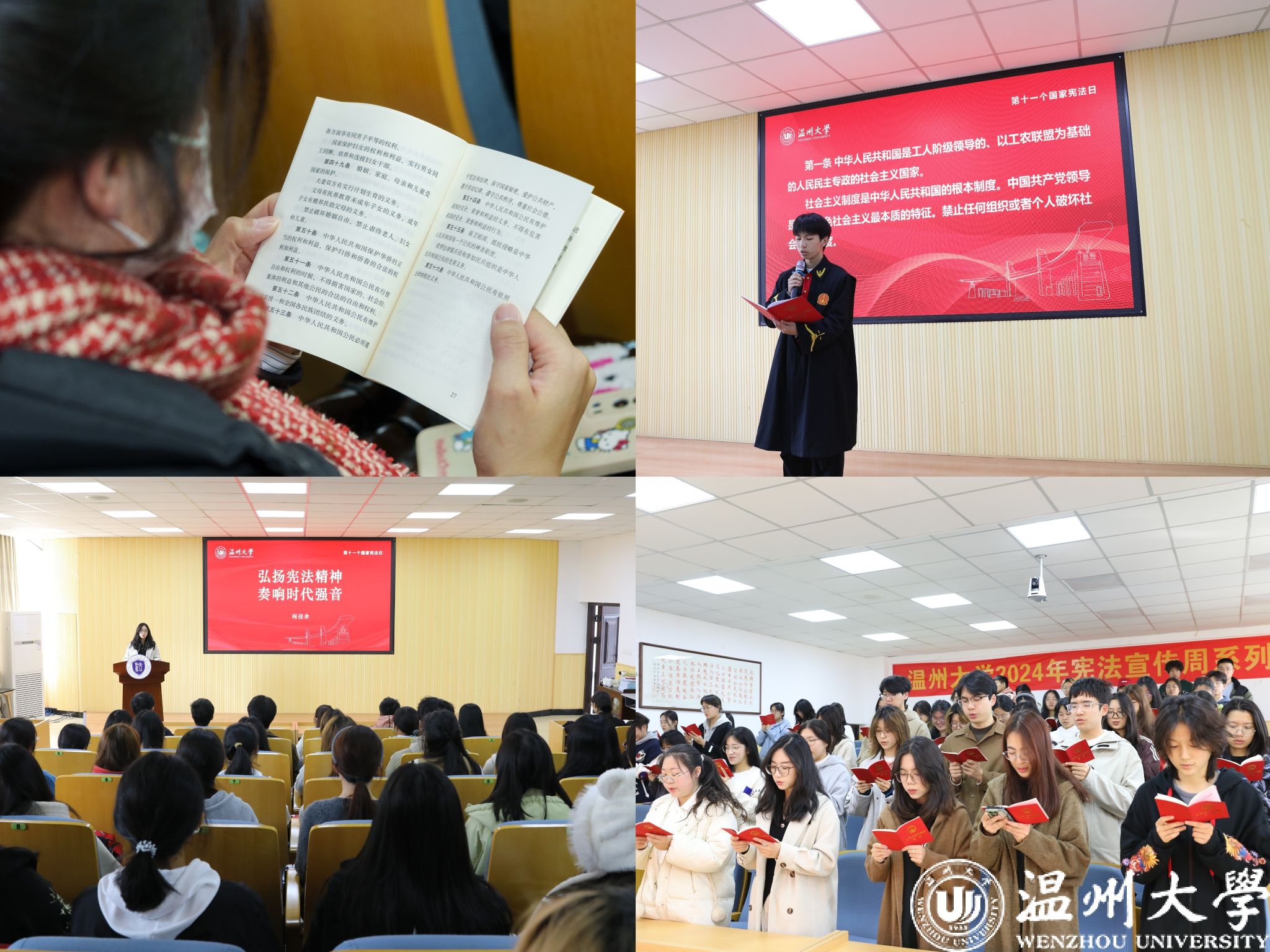为进一步学习宣传贯彻习近平法治思想,大力弘扬宪法精神,维护宪法权威,引导青年学生牢固树立宪法至上意识,在第十一个国家宪法日和全省第四个“宪法与浙江”主题宣传月活动来临之际,温州大学组织开展2024年宪法宣传周系列活动,以“大力弘扬宪法精神 推动进一步全面深化改革”为主题,主动探索“特色活动+常态化宣传”的普法新模式,以精彩纷呈、充满趣味的形式为广大师生带来了一堂堂“有声有色”的法治课。