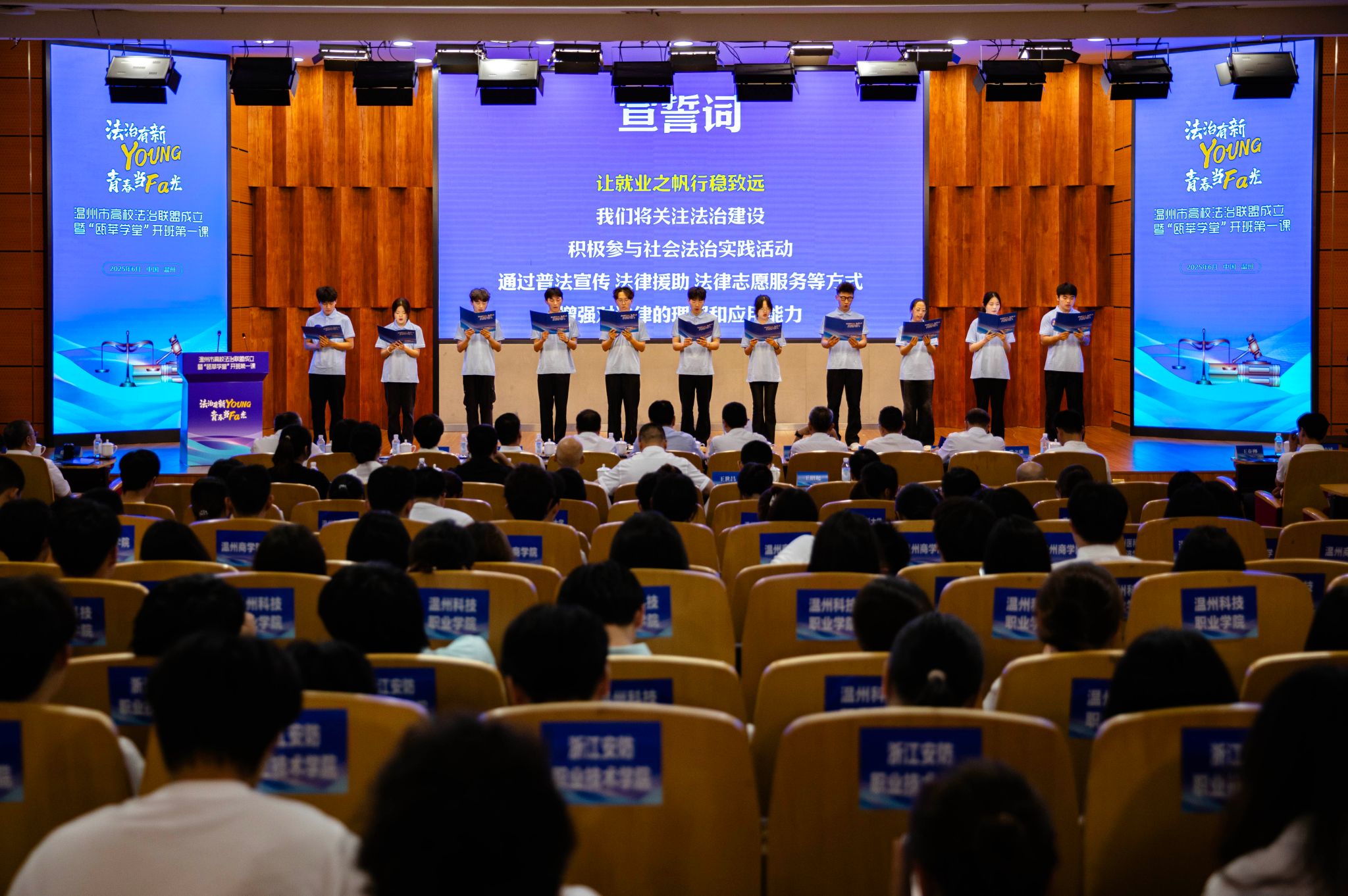 “我自愿成为法治建设的践行者、法治文化的传播者、公平正义的守护者!”铿锵誓言在温大校园里回荡,来自11所高校学生代表庄严宣誓。