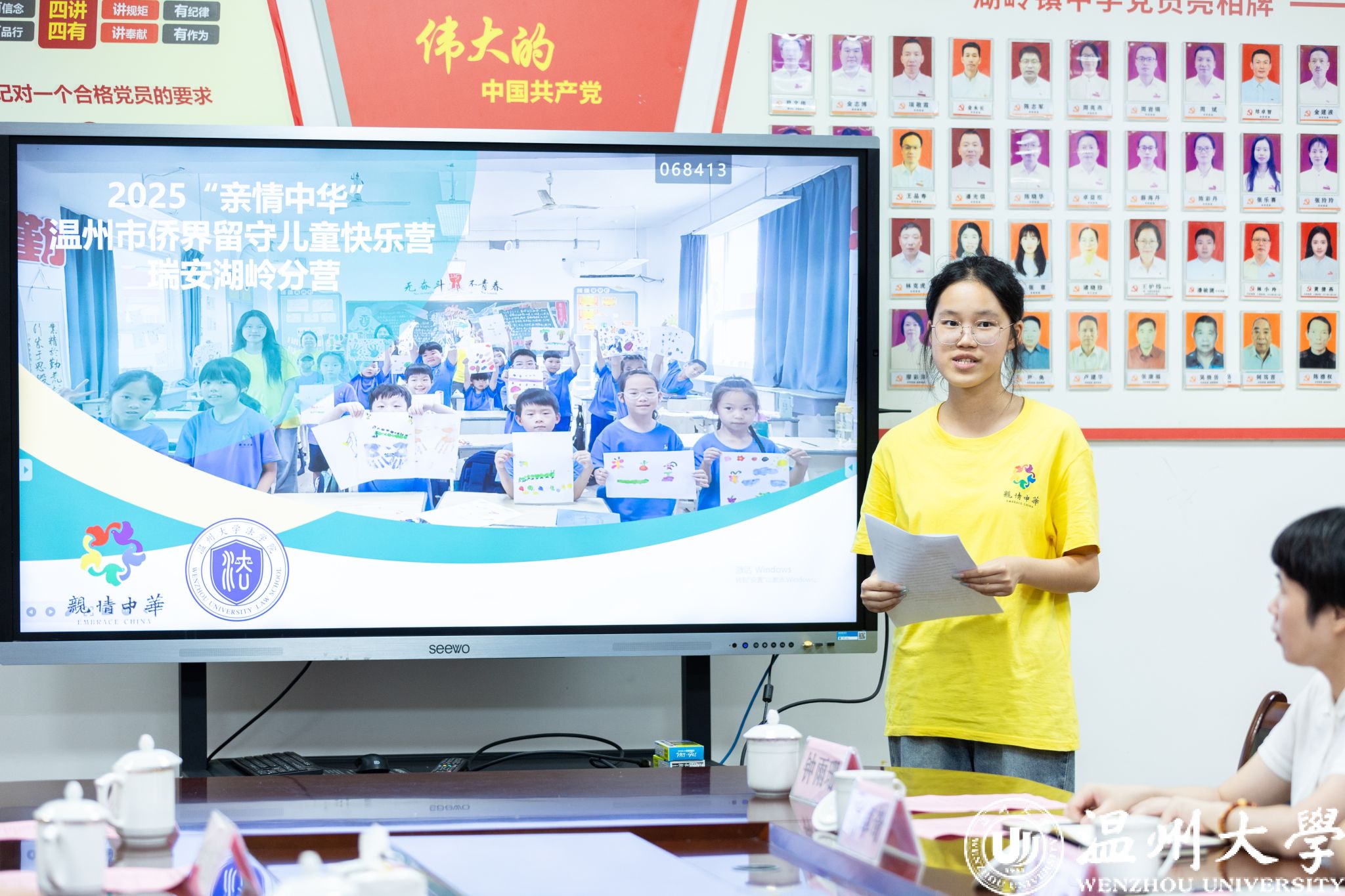 7月21日下午,温州大学校长、党委副书记赵敏,中共瑞安市委常委、统战部部长林圣赞,瑞安市湖岭镇党委书记孔万钦,瑞安市侨联党组书记、主席罗晓伟一行亲切慰问第十六季“亲情中华”温州市侨界留守儿童快乐营湖岭分营。学校相关部门负责人、麻将胡了试玩 主要领导和湖岭镇相关同志一同参加慰问。麻将胡了试玩 “亲情中华”温州市侨界留守儿童快乐营迄今已开展十六季,累计服务侨界留守儿童两万余人次,取得社会各界广泛关注并获得丰硕成果,成为温州大学服务侨乡、连接侨心的闪亮名片。今年暑期,快乐营走进瑞安湖岭、高楼两地开展为期21天的实践活动,用真情陪伴守护侨界留守儿童的成长。