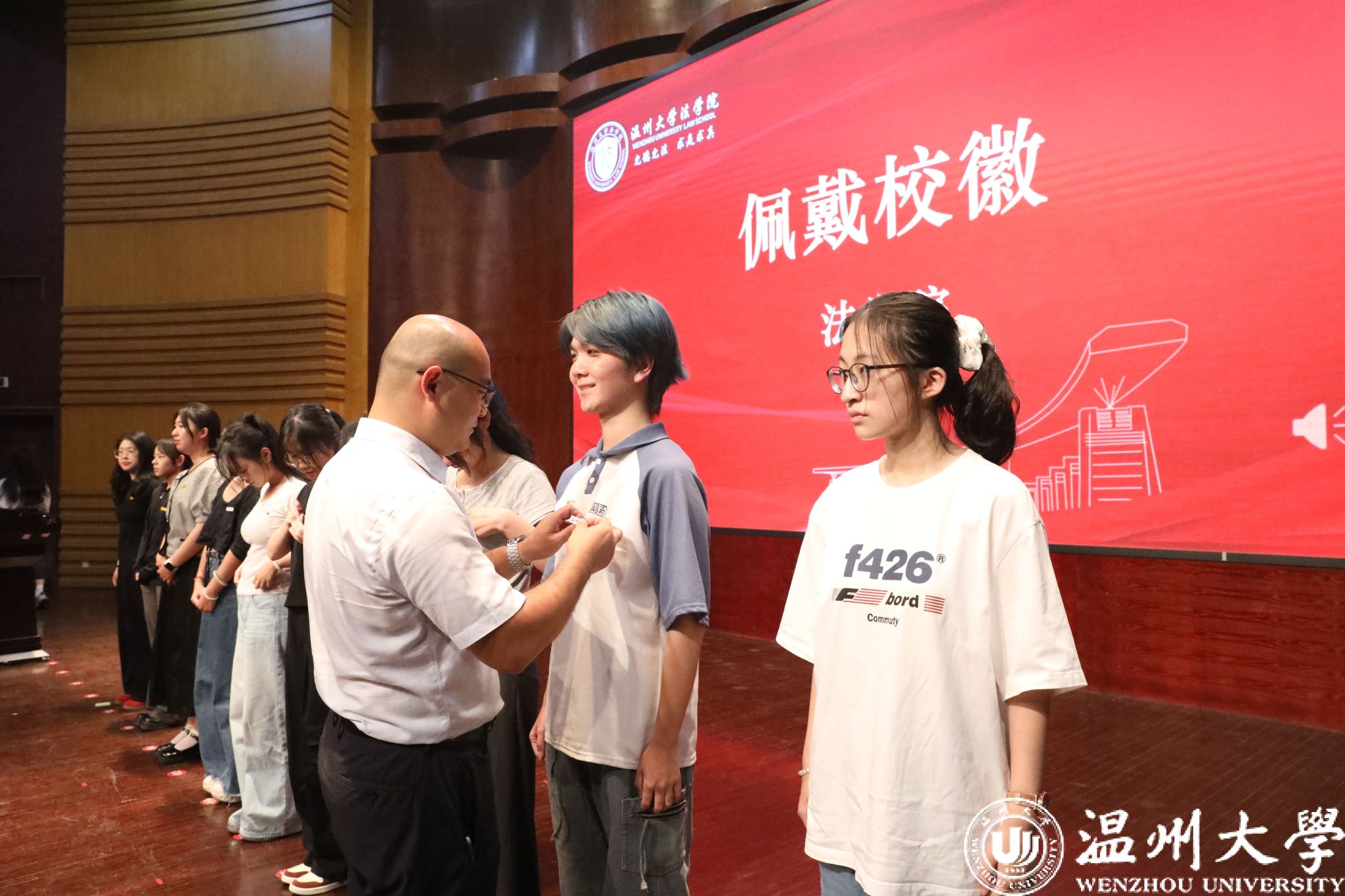 现场还举行了校徽佩戴仪式,党委副书记郑兆钧为新生代表逐一佩戴校徽,其他新生在现场同时佩戴校徽。这枚徽章不仅象征着同学们正式成为温州大学的一员,更承载着“求学问是、敢为人先”的温大精神。从此刻起,他们将肩负起温大人的责任与使命,在这片沃土上书写属于自己的成长新篇。