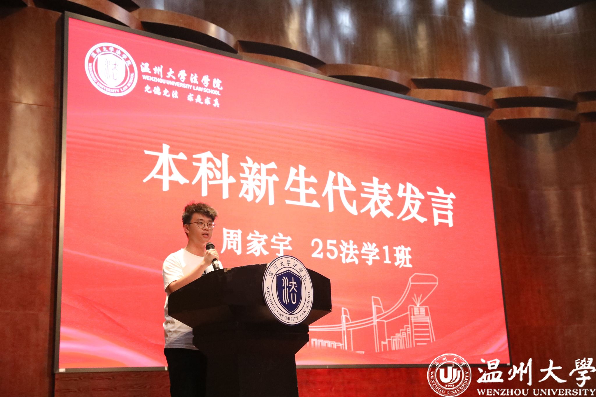 本科新生代表周家宇同学分享了自己初入温大的感受和对法学专业的热爱。他表示,选择法学不仅是向往正义,更是希望以法律守护普通人的尊严与公平。期待在大学中深入研读经典、积极参与思辨与实践,将专业学习与社会现实相连,呼吁同学们带着饱满的热情,在温大这片沃土上以法为翼、不负时代,成长为兼具专业能力与社会责任感的法律人,为中国法治建设贡献青春力量。