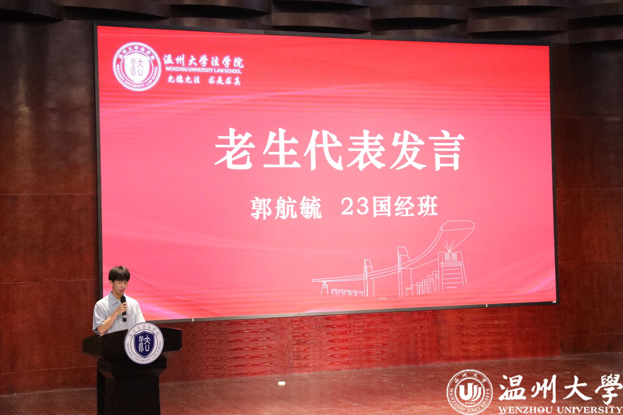 研究生新生代表冯徐轩深情回顾了考研路上的执着坚守与不懈奋斗,坦言正是这份共同的坚韧,让大家在温大相聚。她将校训“求学问是,敢为人先”与院训“允德允法,求是求真”融入期许,提出在研究生三年中应努力做到“三个把”:把研究做在书斋里,夯实专业基础,深植法学理论;把论文写在大地上,聚焦现实需求,服务温州民营经济与营商环境建设;把人生安放在时代里,德法兼修,勇担社会责任。她号召全体新生以青春为笔、以理想为墨,潜心求索,向着成长与理想坚定前行!